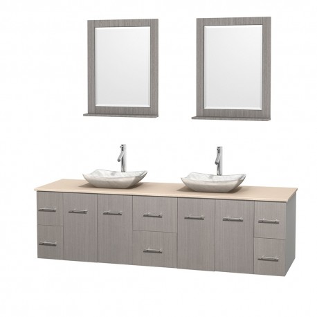 80 inch Double Bathroom Vanity in Gray Oak, Ivory Marble Countertop, Avalon White Carrera Marble Sinks, and 24 inch Mirrors