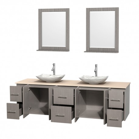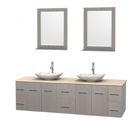 80 inch Double Bathroom Vanity in Gray Oak, Ivory Marble Countertop, Arista White Carrera Marble Sinks, and 24 inch Mirrors