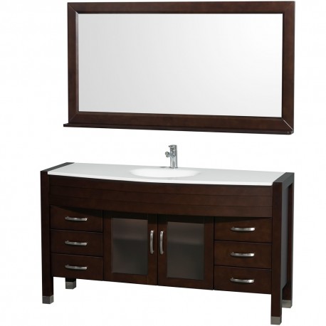 "The Daytona 60"" Single Bathroom Vanity Set - a modern classic with elegant, contemporary lines. This beautiful centerpiece, made in solid, eco-friendly zero emissions wood, comes complete with mirror and choice of counter for any decor. From fully extending drawer glides and soft-close doors to the 3/4"" glass or marble counter, quality comes first, like all Wyndham Collection products. Doors are made with fully framed glass inserts, and back paneling is standard. Available in gorgeous contemporary Cherry or rich, warm Espresso (a true Espresso that's not almost black to cover inferior wood imperfections). Transform your bathroom into a talking point with this Wyndham Collection original design, only available in limited numbers. All counters are pre-drilled for single-hole faucets, but stone counters may have additional holes drilled on-site."