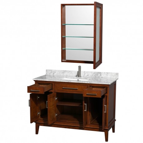 48 inch Single Bathroom Vanity in Light Chestnut, White Carrera Marble Countertop, Undermount Square Sink, and Medicine Cabinet