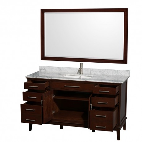 60 inch Single Bathroom Vanity in Dark Chestnut, White Carrera Marble Countertop, Undermount Square Sink, and 56 inch Mirror
