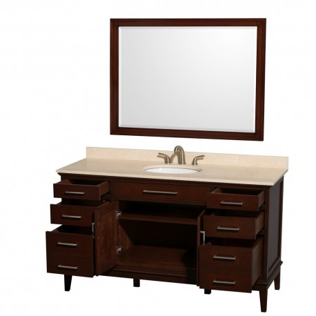 60 inch Single Bathroom Vanity in Dark Chestnut, Ivory Marble Countertop, Undermount Oval Sink, and 44 inch Mirror