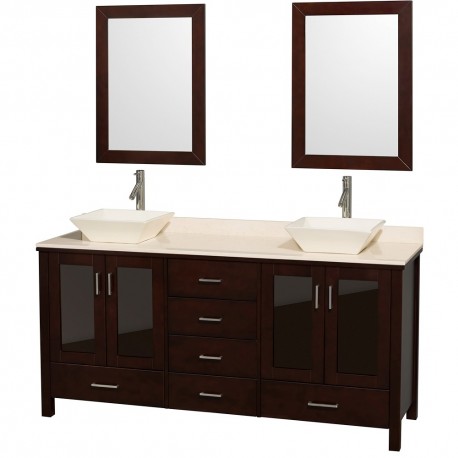 72 inch Double Bathroom Vanity in Espresso, Ivory Marble Countertop, Pyra Bone Porcelain Sinks, and 24 inch Mirrors