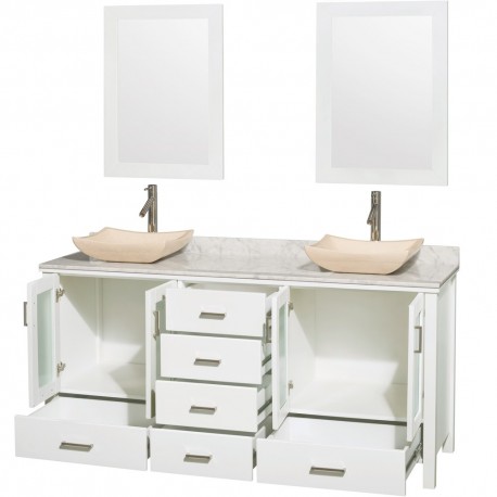 72 inch Double Bathroom Vanity in White, White Carrera Marble Countertop, Avalon Ivory Marble Sinks, and 24 inch Mirrors