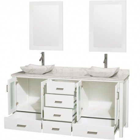 72 inch Double Bathroom Vanity in White, White Carrera Marble Countertop, Avalon White Carrera Marble Sinks, and 24 inch Mirrors