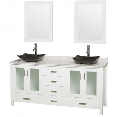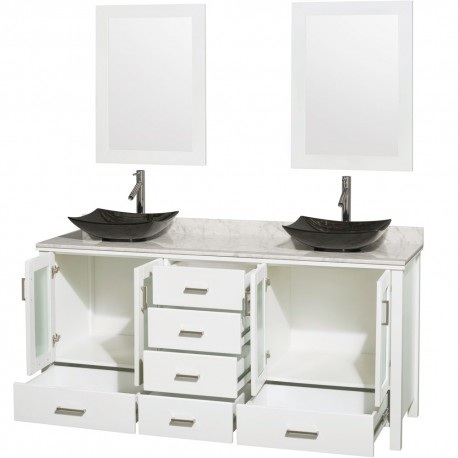 72 inch Double Bathroom Vanity in White, White Carrera Marble Countertop, Arista Black Granite Sinks, and 24 inch Mirrors