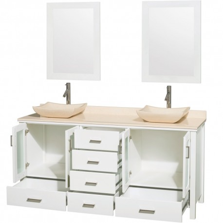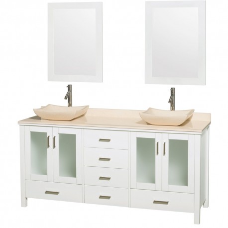 72 inch Double Bathroom Vanity in White, Ivory Marble Countertop, Avalon Ivory Marble Sinks, and 24 inch Mirrors