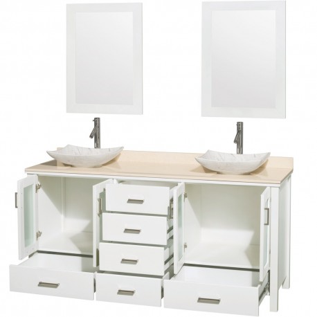 72 inch Double Bathroom Vanity in White, Ivory Marble Countertop, Arista White Carrera Marble Sinks, and 24 inch Mirrors