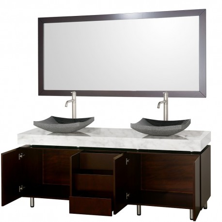 72 inch Double Bathroom Vanity in Espresso, White Carrera Marble Countertop, Altair Black Granite Sinks, and 70 inch Mirror