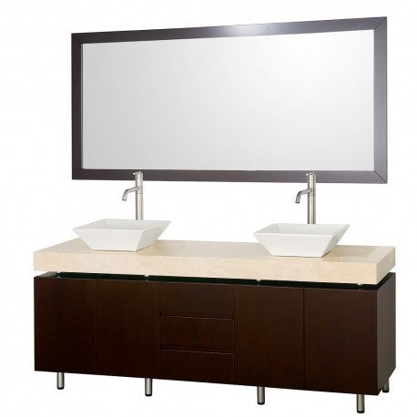 72 inch Double Bathroom Vanity in Espresso, Ivory Marble Countertop, Pyra White Porcelain Sinks, and 70 inch Mirror