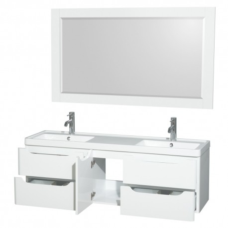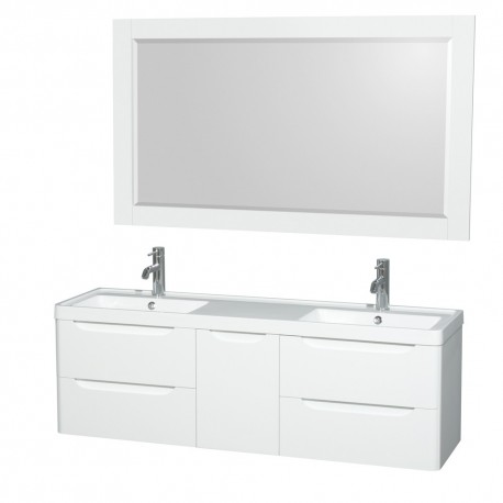 60 inch Double Bathroom Vanity in Glossy White, Acrylic-Resin Countertop, Integrated Sinks, and 58 inch Mirror