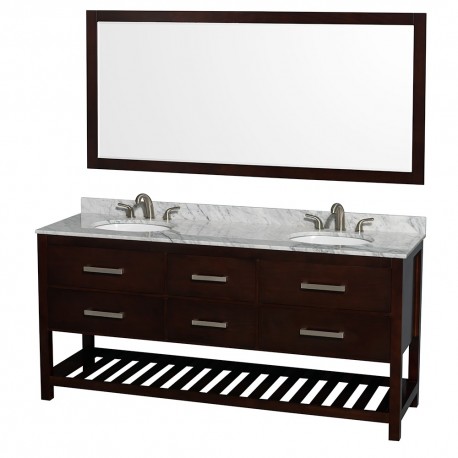 72 inch Double Bathroom Vanity in Espresso, White Carrera Marble Countertop, Undermount Oval sinks, and 70 inch Mirror
