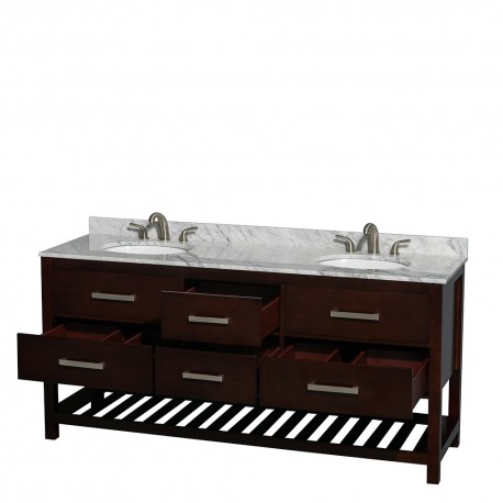 72 inch Double Bathroom Vanity in Espresso, White Carrera Marble Countertop, Undermount Oval sinks, and No Mirror