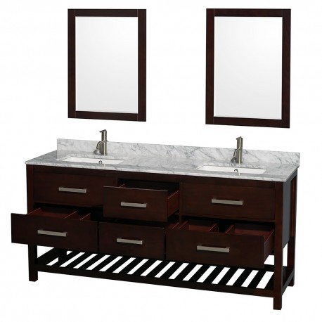 72 inch Double Bathroom Vanity in Espresso, White Carrera Marble Countertop, Undermount Square sinks, and 24 inch Mirrors