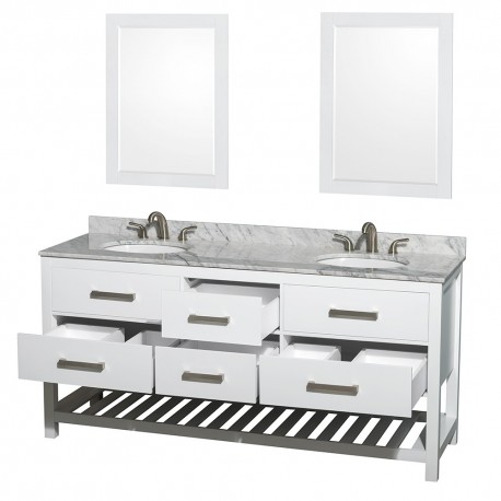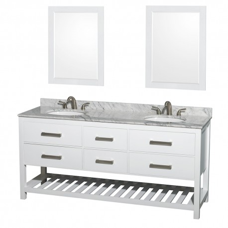 72 inch Double Bathroom Vanity in White, White Carrera Marble Countertop, Undermount Oval sinks, and 24 inch Mirrors