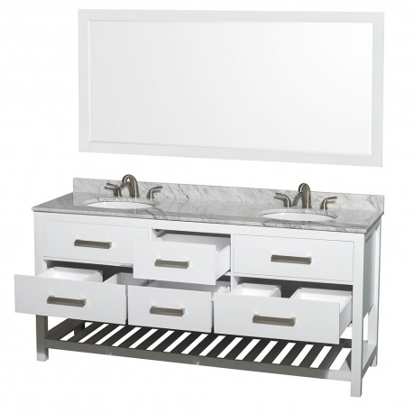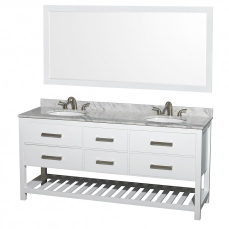 72 inch Double Bathroom Vanity in White, White Carrera Marble Countertop, Undermount Oval sinks, and 70 inch Mirror