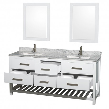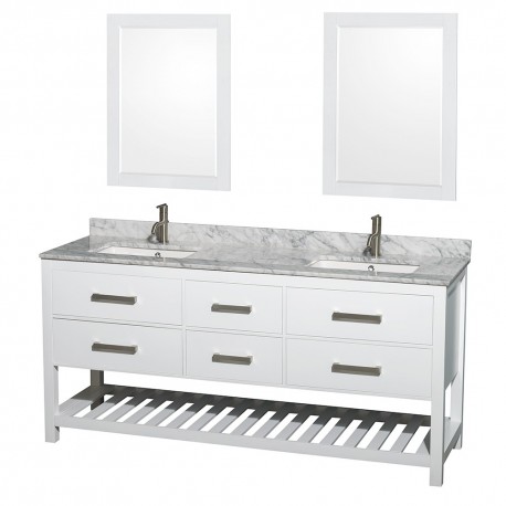 72 inch Double Bathroom Vanity in White, White Carrera Marble Countertop, Undermount Square sinks, and 24 inch Mirrors