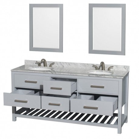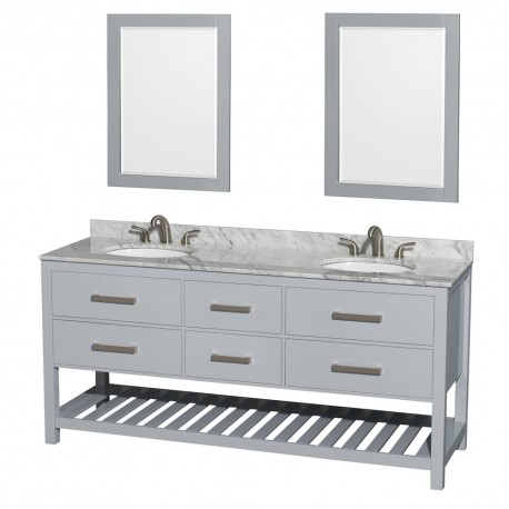 72 inch Double Bathroom Vanity in Gray, White Carrera Marble Countertop, Undermount Oval sinks, and 24 inch Mirrors