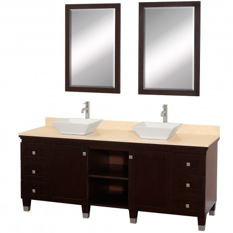 72 inch Double Bathroom Vanity in Espresso, Ivory Marble Countertop, Pyra White Porcelain Sinks, and 24 inch Mirrors