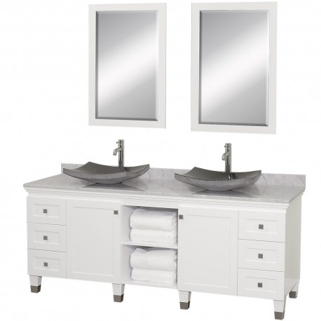72 inch Double Bathroom Vanity in White, White Carrera Marble Countertop, Altair Black Granite Sinks, and 24 inch Mirrors