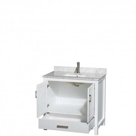 36 inch Single Bathroom Vanity in White, White Carrera Marble Countertop, Undermount Square Sink, and No Mirror