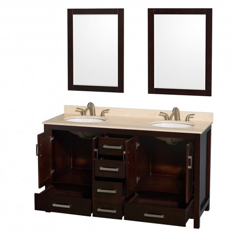 60 inch Double Bathroom Vanity in Espresso, Ivory Marble Countertop, Undermount Oval Sinks, and 24 inch Mirrors