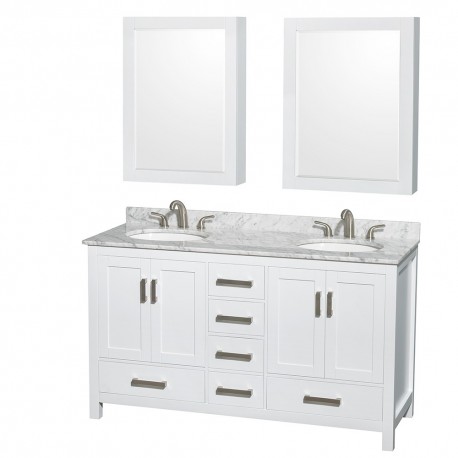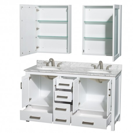 60 inch Double Bathroom Vanity in White, White Carrera Marble Countertop, Undermount Oval Sinks, and Medicine Cabinets