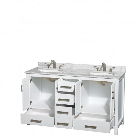 60 inch Double Bathroom Vanity in White, White Carrera Marble Countertop, Undermount Oval Sinks, and No Mirror