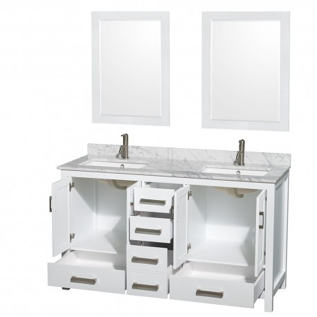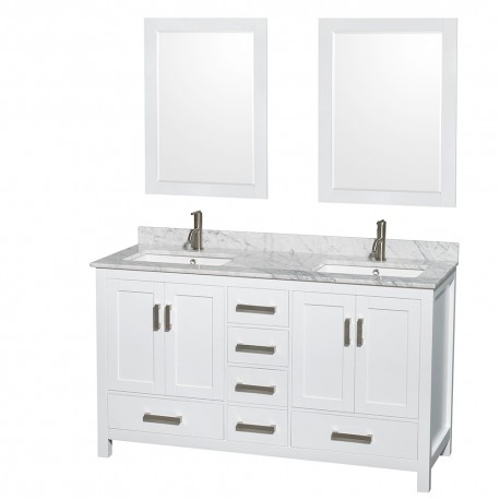 60 inch Double Bathroom Vanity in White, White Carrera Marble Countertop, Undermount Square Sinks, and 24 inch Mirrors