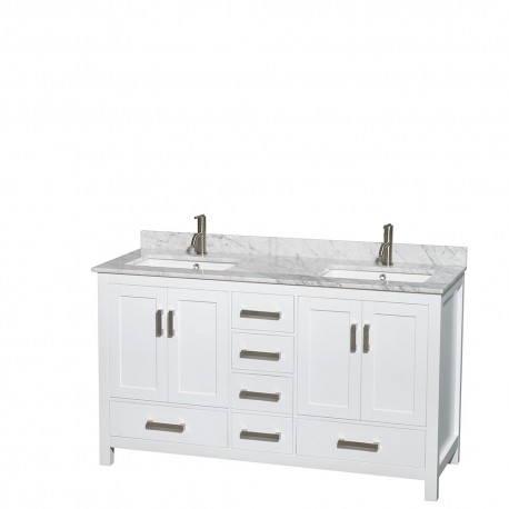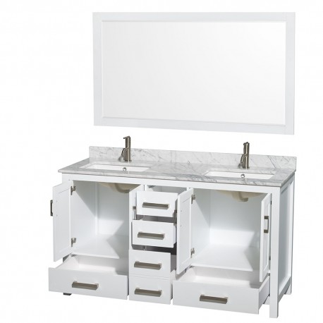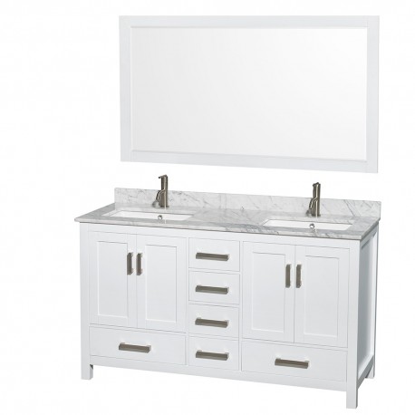60 inch Double Bathroom Vanity in White, White Carrera Marble Countertop, Undermount Square Sinks, and 58 inch Mirror
