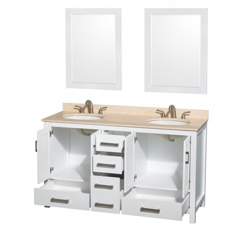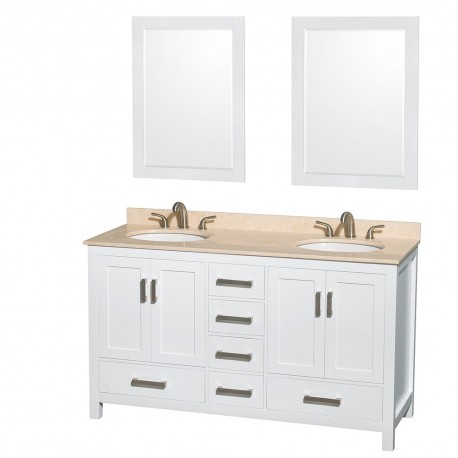 60 inch Double Bathroom Vanity in White, Ivory Marble Countertop, Undermount Oval Sinks, and 24 inch Mirrors