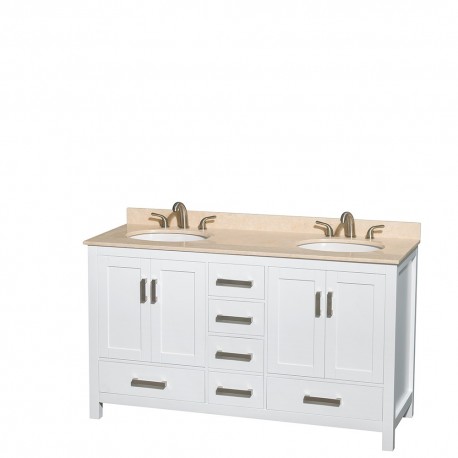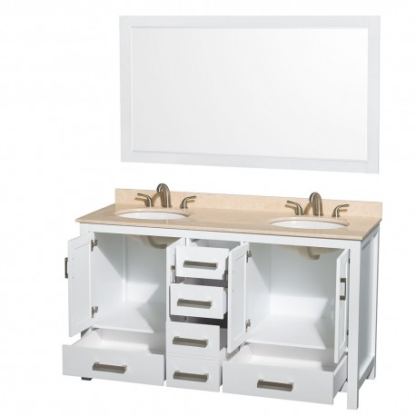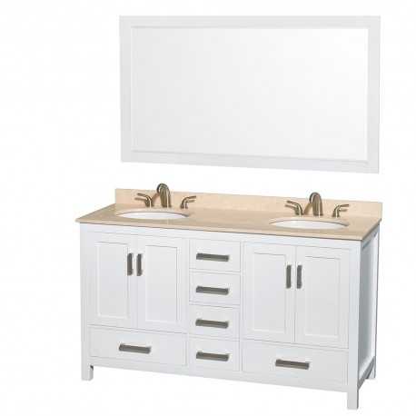 60 inch Double Bathroom Vanity in White, Ivory Marble Countertop, Undermount Oval Sinks, and 58 inch Mirror