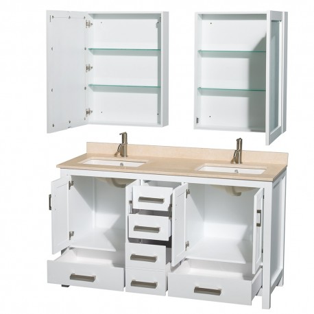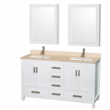 60 inch Double Bathroom Vanity in White, Ivory Marble Countertop, Undermount Square Sinks, and Medicine Cabinets