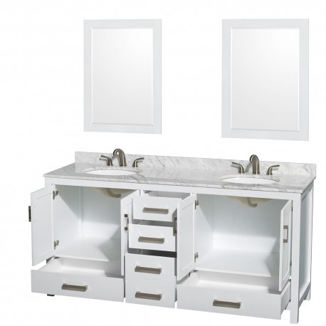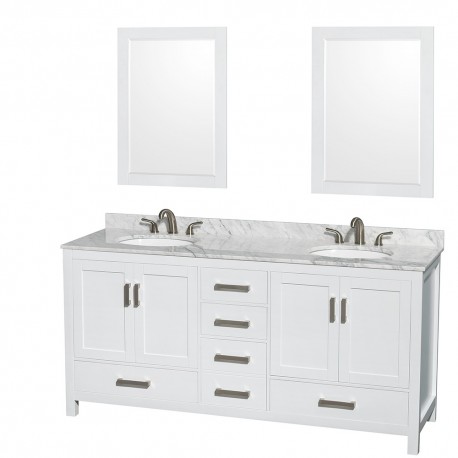 72 inch Double Bathroom Vanity in White, White Carrera Marble Countertop, Undermount Oval Sinks, and 24 inch Mirrors