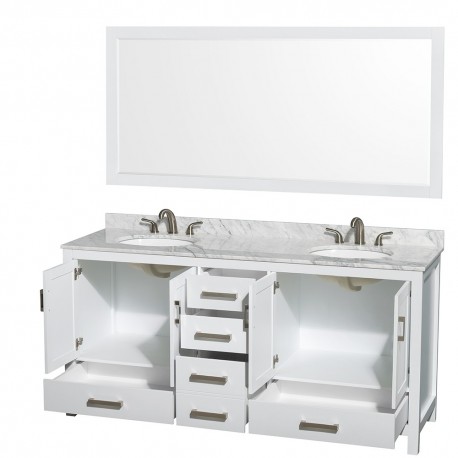 72 inch Double Bathroom Vanity in White, White Carrera Marble Countertop, Undermount Oval Sinks, and 70 inch Mirror
