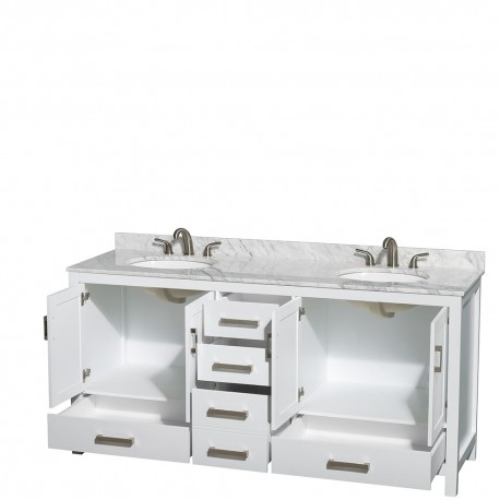 72 inch Double Bathroom Vanity in White, White Carrera Marble Countertop, Undermount Oval Sinks, and No Mirror