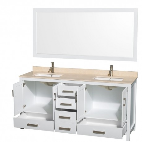 72 inch Double Bathroom Vanity in White, Ivory Marble Countertop, Undermount Square Sinks, and 70 inch Mirror