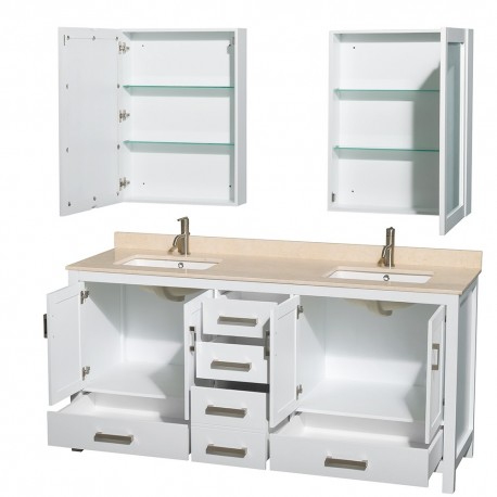 72 inch Double Bathroom Vanity in White, Ivory Marble Countertop, Undermount Square Sinks, and Medicine Cabinets