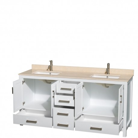 72 inch Double Bathroom Vanity in White, Ivory Marble Countertop, Undermount Square Sinks, and No Mirror