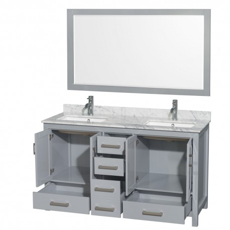 60 inch Double Bathroom Vanity in Gray, White Carrera Marble Countertop, Undermount Square Sinks, and 58 inch Mirror