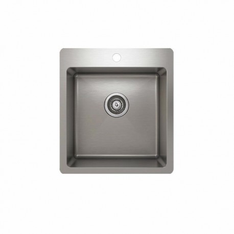 Material: 304 Brushed Finish Stainless Steel (18/10) - 18 gaugeMounting: TopmountBowls: Single Bowl Handcrafted Kitchen Sink3" rear edge with single hole for faucet installation1" edge on all other sidesSound deadening padsDrain located towards rear providing more space under sinkStrainer and mounting hardware includedProduct certified ASME A112.19.3, CSA B45.0, and CSA B45.4Limited lifetime warranty Bowl Size: 16" x 16" x 9" Overall Dimension: 18" x 20" x 9" Recommended Cabinet Width: 21" Drain: Rear 3.5"Packaging: 19" x 21-1/2" x 13" (20lbs)