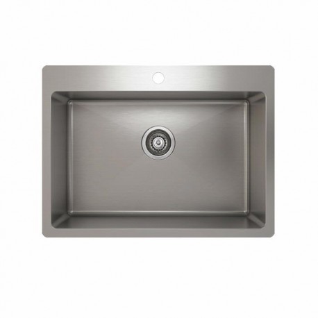 Material: 304 Brushed Finish Stainless Steel (18/10) - 18 gaugeMounting: TopmountBowls: Single Bowl Handcrafted Kitchen Sink3" rear edge with single hole for faucet installation1" edge on all other sidesSound deadening padsDrain located towards rear providing more space under sinkStrainer and mounting hardware includedProduct certified ASME A112.19.3, CSA B45.0, and CSA B45.4Limited lifetime warranty Bowl Size: 25" x 16" x 9" Overall Dimension: 27" x 20" x 9" Recommended Cabinet Width: 30" Drain: Rear 3.5"Packaging: 28" x 21-1/2" x 13" (25lbs)