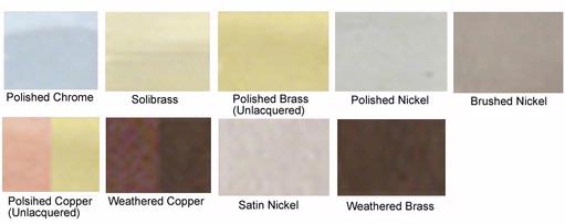 Finishes- Polished Crhome, Solibrass, Polished Brass, Polished Nickel, Brushed Nickel, Satin Nickel and Weathered Brass.