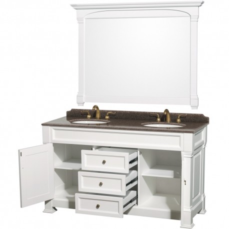 60 inch Double Bathroom Vanity in White, Imperial Brown Granite Countertop, Undermount Oval Sinks, and 56 inch Mirror