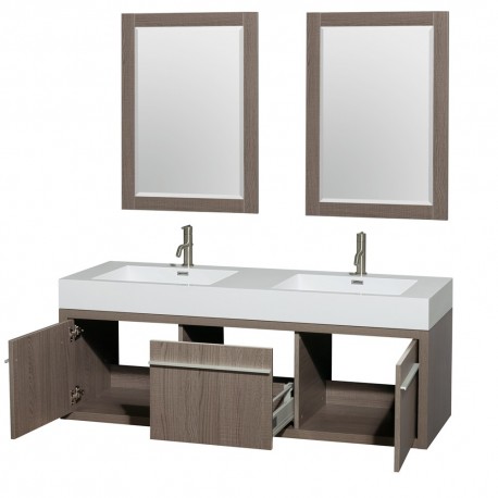60 inch Double Bathroom Vanity in Gray Oak, Acrylic Resin Countertop, Integrated Sinks, and 24 inch Mirrors