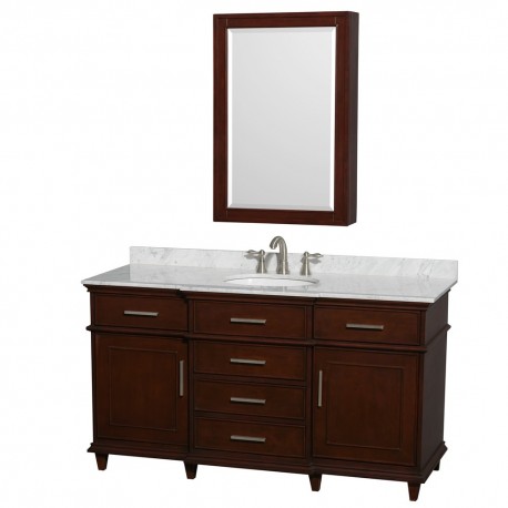 60 inch Single Bathroom Vanity in Dark Chestnut, White Carrera Marble Countertop, Undermount Round Sink, 24 inch Medicine Cabinet