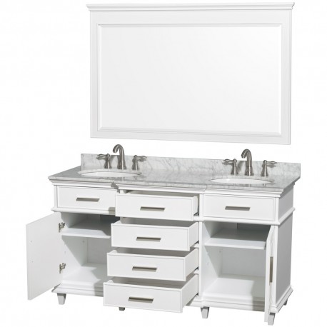 60 inch Double Bathroom Vanity in White with White Carrera Marble Top with White Undermount Oval Sinks and 56 inch Mirror