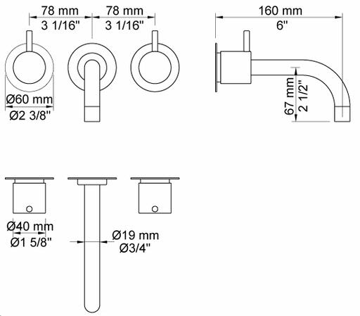 Wall Mount: VOLA Two-Handle Basin Mixer, 6" Spout in Center and Rosette (1.3 gpm) - 1511Two Handle Basin Set - 1511